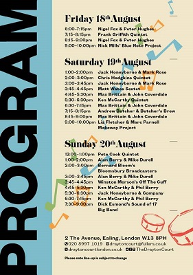 Organisrs says the Drayton Court Festival embodies the critical elements that underpinned the former popularity and success of the original Ealing Jazz Festival: accessible and popular jazz from well-known bands with local connections, and free admission. Dick Esmond who founded and compered the original festival for 30 years says “the Drayton Court line-up for this year is as good as ever and brings home the amazing jazz talent based in Ealing”.