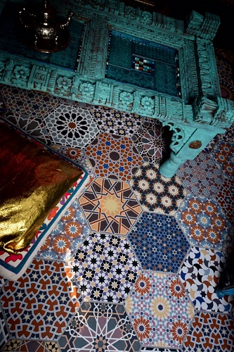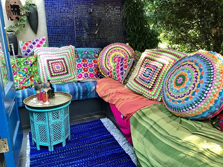 A trip to North Africa gave exactly the design inspiration they needed and rich fabrics, tiles and bright cushions were sourced online and Liz also made use of old saris which she found in a charity shop in Norwood Green.