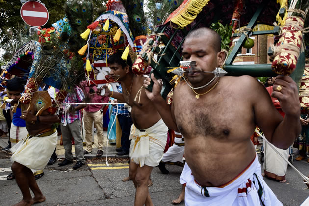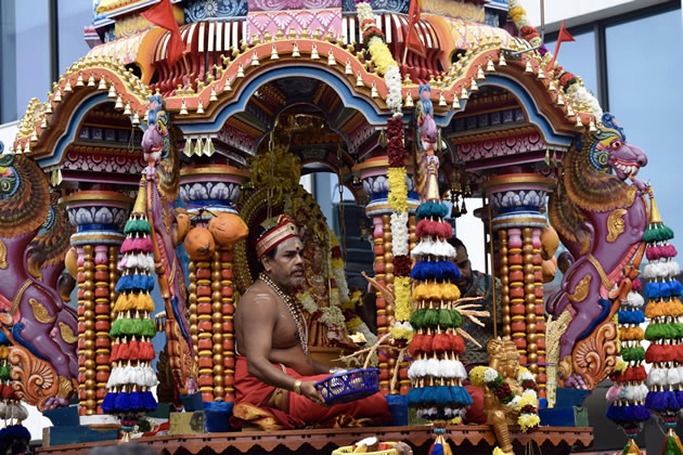 The festival honours the victory of the war god Murugan over a demon using a divine spear. As well as pulling the chariots devotees in traditional dress rolled along the road, carried milk jugs on their heads and sported elaborate piercings. Offerings in baskets are presented to the gods. Musicians accompanied to the parade adding to the festive atmosphere. This year there was also a fundraising market in Dean Gardens.