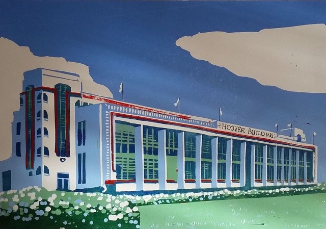 Hoover Building Linocut by Jessica Rose