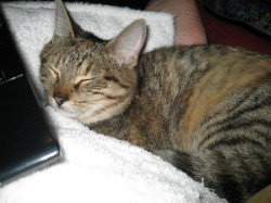 She is a 9 month old tabby, she has a collar on which was black and had a flying witches motif on it. She is fairly light in colour and has a little bit of ginger on her forehead.