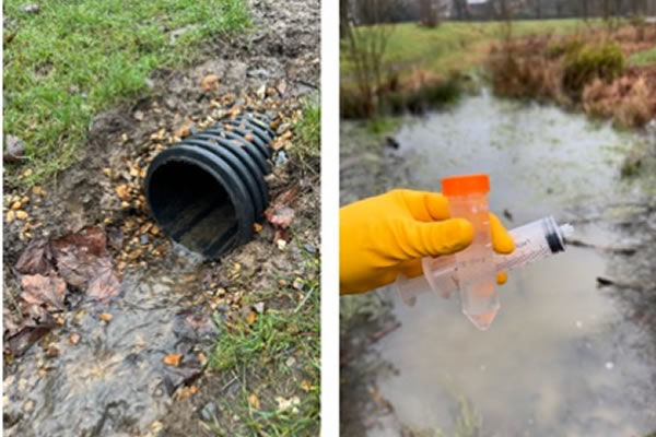 A pipe feeding surface water drainage into Lammas Park (left) and a test being carried out on the water (right).