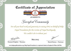 The charity want to say ‘Thank You’ to the Greenford Community for their huge generosity in helping the victims of the Nepal Earthquake and have issued a a Certificate of Appreciation which they would like to share.