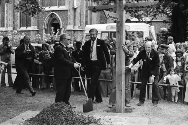 (L-R) Mayor of Ealing, Cllr John Johnston and Luke FitzHerbert plant the first Brent River Park sign post outside St Mary's Church on Churchfields (29 June 1975). Picture: Colin Miell