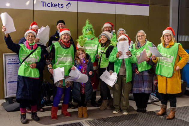 Ealing Samaritans supporters singing carols at Ealing Broadway Station. Picture: Roger Green