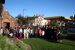 The Reverend Dr John Hereward, Vicar of St Mellitus Church,  Hanwell W7, and protesters standing in St Mellitus Church garden