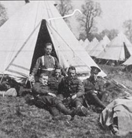 Rifleman William Eve and comrades of 1/16th (County of London) Battalion (Queen’s Westminster Rifles), The London Regiment, outside their tent, 1914