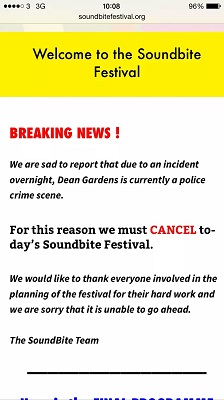 For this reason we must CANCEL today’s Soundbite Festival.We would like to thank everyone involved in the planning of the festival for their hard work and we are sorry that it is unable to go ahead.