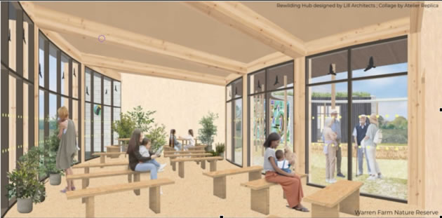 The ‘Warren Farm Nature Reserve - Rewilding Hub’ is envisioned to be a specialist, environmentally friendly building for the community, schools, universities and environmental organisations. It would provide a space where educational, well-being, nature connection and artistic activities could be held. It is also hoped it could become London’s expert-led rewilding centre of excellence.