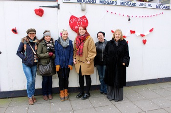 “We had Deadly Knitshade, a famous graffiti knitter talk at our January meeting and we were really inspired. As we have been volunteering at the Music and Film Valentine Festival this weekend we wanted to tie the two together. Many of our members have knitted, crocheted and sewn hearts over the past few weeks and we applied them to the hoarding on Saturday morning. It’s outrageous that given Ealing’s historic contribution to film that we still don’t have a dedicated cinema. What better way to demonstrate that by covering the site with hearts to show our love of film?”