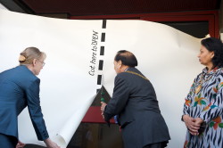 The Mayor of Ealing Councillor Rajinder Mann (centre) officially opens the arts project, with Chair of the West Ealing Arts Project Committee Ann Pavett (left) and the Mayoress of Ealing, Councillor Gurmit Mann. .