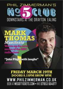 No 5 Club, Friday March 29: MARK THOMAS, MANIFESTO. Tickets £12 from http://www.wegottickets.com/No5Club. Downstairs at The Drayton Court, 2