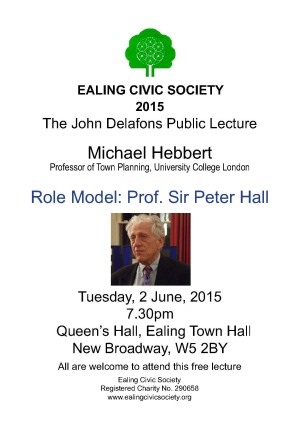 All are welcome to attend Ealing Civic Society’s John Delafons annual lecture on Tuesday 2 June 2015 at 7.30 PM in the Queen’s Hall, Ealing Town Hall, Uxbridge Rd, W5 2BY.