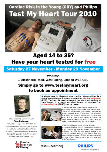Waitrose in West Ealing will be the location for three days of free heart screenings in memory of local teenager Tom Clabburn, who died aged 14, from an undiagnosed heart condition.