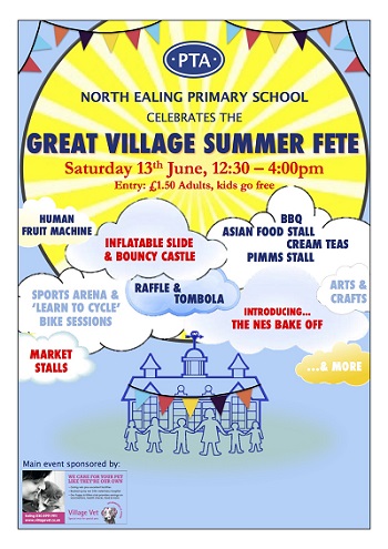 The North Ealing Primary School on Pitshanger Lane is holding a "Great Village Summer Fete" on Saturday June 13th from 1230 to 4pm.