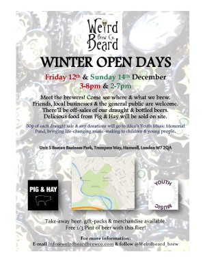 The brewers will be hosting two Open Days on Friday 12th and Sunday 14th December. Local residents and businesses are invited to sample the wares on site or take-away purchases.