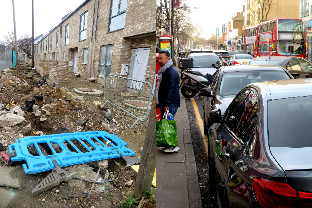 Uncompleted building works on Felix Road (left) and congestion on Uxbridge Road