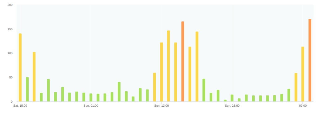 A second tracking website, airvisual.com, shows spikes at 10am on Sunday and 11am on Monday, with far lower spikes of around 170 micrograms.