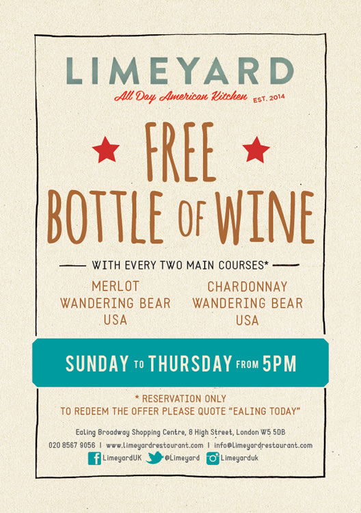 Limeyard, the All Day American Kitchen, is offering customers a free bottle of wine to EalingToday readers. Customers ordering two main courses Sundays to Thursdays after 5pm can choose between a bottle of Wandering Bear Merlot or Wandering Bear Chardonnary.