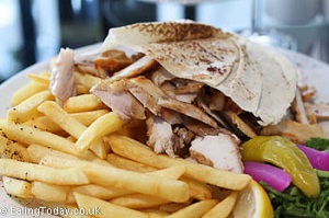 My partner went for the chicken and chips option - or more interestingly titled - Shish Taouk which is grilled skewers of marinated chicken cubes, served with or without garlic sauce. The portion size, even for him, was huge, so he didn't dip into my delights quite as quickly as he would normally have done.