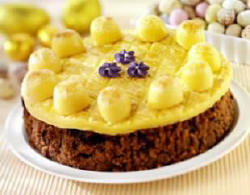 Simnel Cake is traditionally eaten at Easter and in medieval days female servants would bake this fruit rich cake to take home on their rare visits their mother's on Mothering Sunday which was the fourth Sunday during the Lent period.