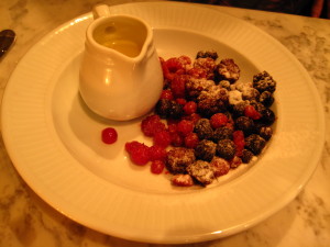 A selection of cheeses for him (Roquefort and Reblochon served with bread and grapes £5.85) and Iced summer berries with warm white chocolate sauce ( £4.50) for me , an expresso and a refreshing mint tea completed our very enjoyable dining experience.