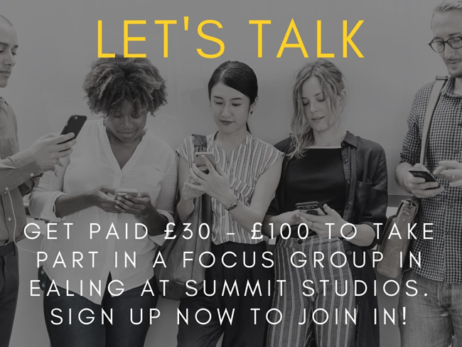 Summit Studios are always seeking chatty, confident respondents to take part in interesting market research projects in Ealing Broadway. For each project you are selected to take part in you will receive a cash thank you gift of £30.00- £100.00, with sessions typically lasting between 1 to 3 hours.