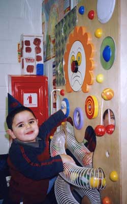 Adam Echhaibi, 2, tries out an interactive play panel at the toy