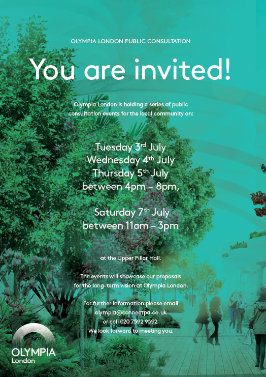 Olympia London is holding a series of public consultation events for the local community in the 3rd, 4th and 5th July 2018 between 4pm and 8pm, and on 7th July 2018 between 11am and 3pm the Upper Pillar Hall. The events will showcase our proposals for the long-term vision for Olympia.