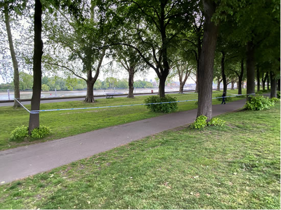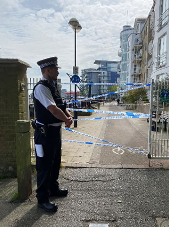 Police tape and office block access from Prospect Quay