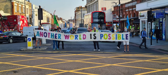 The demonstration took place from 8.30 to 9.30am and from 3.30-4.30pm – the times when traffic is heaviest. Protesters held banners across the roads during the "green man" pedestrian right of way saying “Another World is Possible” and “NO2IDLING”.
