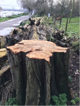They told us, "Over the past few years there has been increasing destruction of the trees along it. Over 50 trees were destroyed in 2016 at the behest of Fulham Football Club and the Sailing Club, followed up in 2017 by the PLA doing further damage and removing more trees. Consequently many of the trees left standing are now completely exposed to the prevailing south westerly winds, or are undermined by the aggressive re-concreting carried out by the PLA along the shore."