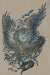 He has tattoos of dragons on his chest and left shoulder, tribal designs on both upper arms and an image of a dark-red bird on his right shoulder.