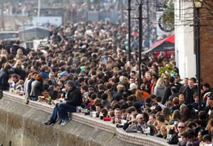 On race day up to 250,000 spectators crowd the banks of the Thames to witness the action.