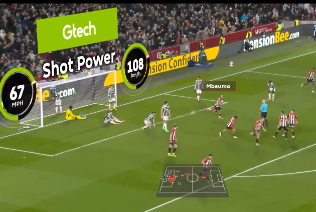 Enhanced display of Brentford scoring against Manchester United. Picture: Brentford FC/Genius Sports