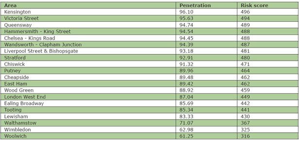 The analysis indicates that residents of London have a combined average risk score of 449. With a score of 471 the risk in Chiswick is nearly 5 times the national average. (see table below)