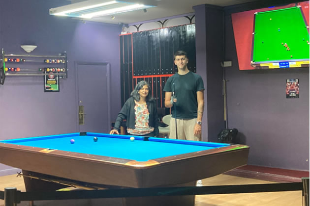 Snooker Loopy: Rupa Huq plays a game of pool with a member of London Snooker. Picture: Rupa Huq MP