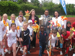 Mary Macleod was joined at the Hounslow Schools Olympic Torch Relay by the Mayor of Hounslow, Councillor Pritam Grewal, Deputy Mayor, Councillor Mindu Bains, the Director of Children’s Services and Lifelong Learning, Judith Petterson, local Councillor Barbara Reid and other Hounslow Borough Councillors.