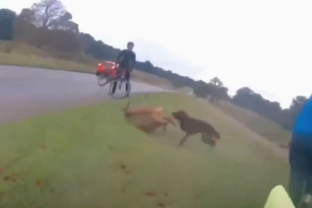 Footage of the incident, which viewers may find upsetting, was captured by a passing cyclists and has been released by the police to serve as a warning to dog owners to ensure that their pets are kept under control.