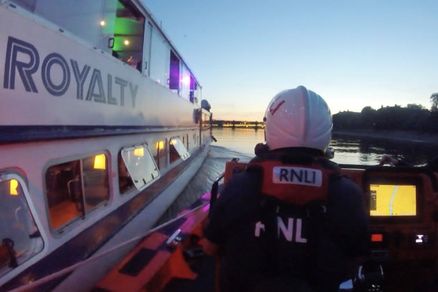 The crew of the Chiswick Lifeboat were debriefing after a casualty care exercise at Broomhouse Pier in Fulham at 9.50pm on 7 July when Thames Commander Mark Turrell noticed the large passenger vessel Royalty manoeuvring strangely.