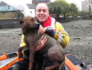 Approaching from the river, RNLI crewman Andy Mayo managed to calm down the now, very muddy dog and brought him into the lifeboat. The lifeboat crew reunited him with his very grateful owner a little way upstream at Crabtree wharf.