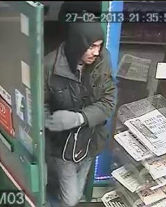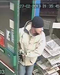 On Wednesday 27 February 2013 between 21:30 and 21:40 hours at Station Parade, Ealing W5 the suspects entered a shop and stole cigarettes from behind the counter and alcohol. The first suspect (a) is described as a black male approximately 30 years of age, wearing a black jacket, a hoody, blue jeans and gloves. The second suspect is described as a white male, also about 30 years of age wearing a white jacket, blue jeans, a black cap and gloves. If you know anything about this incident, contact us quoting photo reference J-327-13a or J-327-13b.