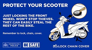 “LOCK, CHAIN AND COVER your scooter to make it less visible to thieves” is the message of the Met’s new ‘Be Safe’ campaign.