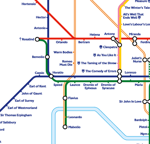 Where possible, plays and characters have also been allocated to ‘interchange’ stations where they would naturally fit on both lines. For example, Macbeth (Embankment station) is on both the “Plays” line (Circle Line) and the “Villains” line (Northern Line) and Lady Macbeth (Charing Cross) is both next to Macbeth and placed at the interchange of the “Heroines” (Bakerloo) and “Villains and Rivals” lines.