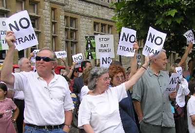 "Anti-tram campaigners staged a lively protest at Ealing Town Hall this week as councillors voted to support the controversial tram scheme. Hundreds of passing motorists joined in by beeping their horns in agreement with the demonstrators.