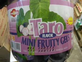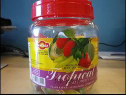 The sweets can be identified as New Choice brand ‘Tropical’ and ‘Taro’ Mini Fruity Gels in 1 kg plastic tubs.