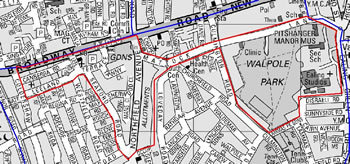 The zone applies to the locality of Walpole Park W13 and the surrounding area :The Broadway West Ealing from the junction of Coldershaw Rd to the junction of Northfield Ave, Canberra Rd, Leeland Terrace, Leeland Rd, Tawny Close, Seaford Rd, Sherwood Close, Bowmans Close, Northfield Ave from the junction of Seaford Rd to the junction of Uxbridge Rd, Mattock Lane, and Walpole Park. Also to include all paths, alleys, grassed areas, service roads and communal stairwells and staircases.