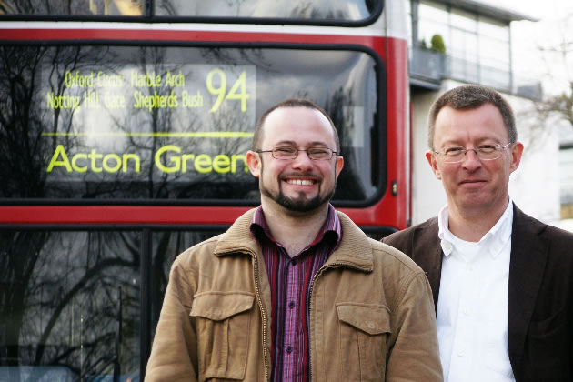 Councillors Gary Malcolm and Andrew Steed at a bus stop in Acton Green