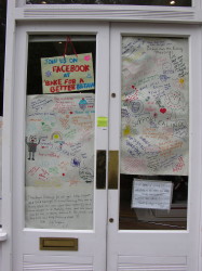 The destruction was demoralising, but Liz has certainly not been defeated. Whilst boarded up, baby e became a focal point and received a huge amount of public support, much of it from children who wrote and painted messages on large paper sheets.