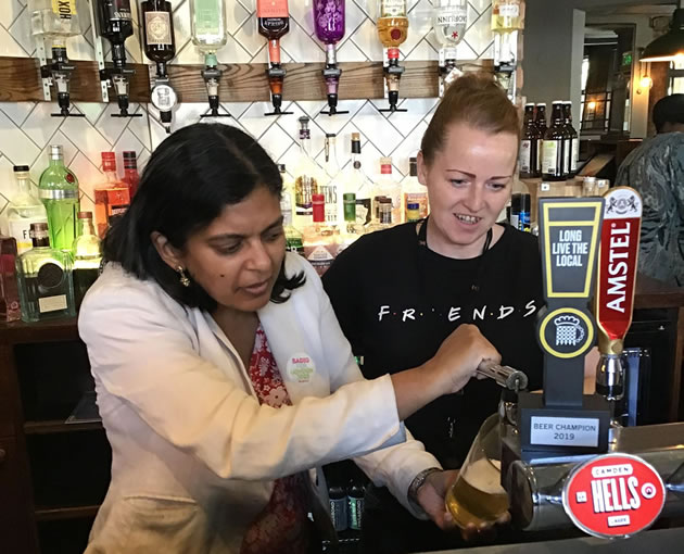 Pulling a pint with her ‘Beer Champion’ tap handle trophy at The Grove pub in Ealing (with staff member Victoria Leigh)